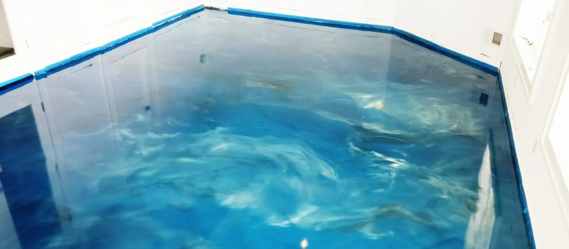 Ocean blue metallic epoxy floor coating installed in a dentist office. Stunning visual depth with a seamless, easy-to-clean surface perfect for healthcare environments.